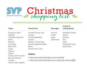 This year we are going to donate to the local St. Vincent De Paul Charity. Donations of cereals, canned foods, pasta, pasta sauce, tea bags, coffee, biscuits, sweets, selection boxes, minerals and other items – all in date are welcome. Please check the list.