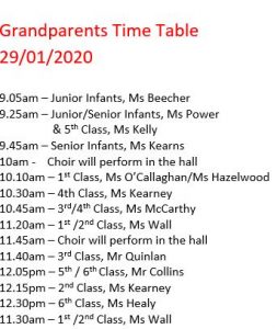 As part of Catholic Schools Week, Grandparents Day will be celebrated in St Colman’s NS on January 29th We invite grandparents and godparents to our classrooms. Please be mindful of our limited space. Enjoy a cup of tea and chat in the hall. The school choir will perform also.